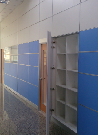 1. 本組合式高隔間構造本體(65mm公差+-3%)系以厚1.2mm鋁合金框架本體,內置6 mm矽酸鈣板,為一塊或一塊以上堆砌結合成一獨立體,其間隙放置間距條使其產生溝槽,可懸掛配件,再依規劃圖形於現場一片一片連結。